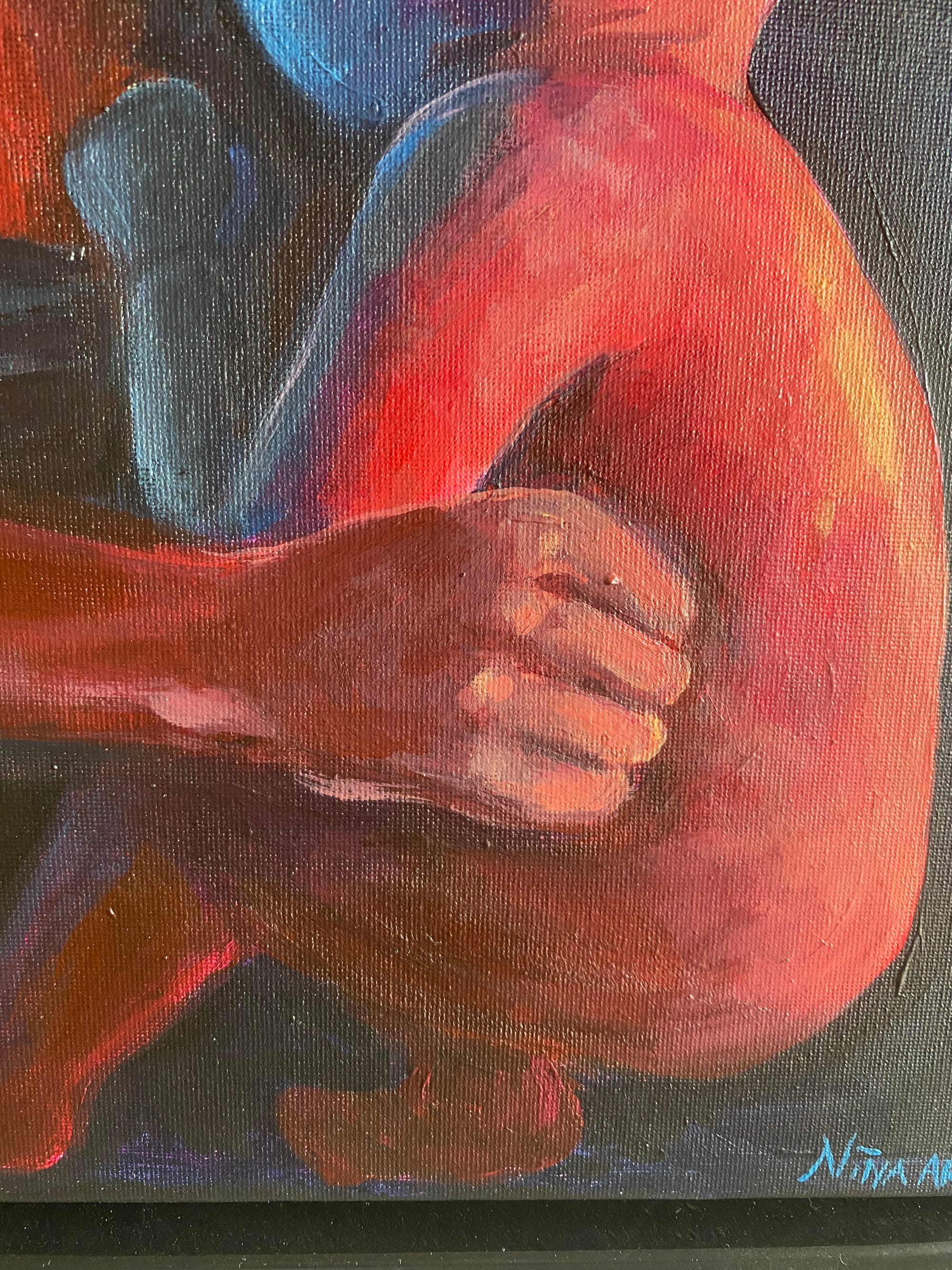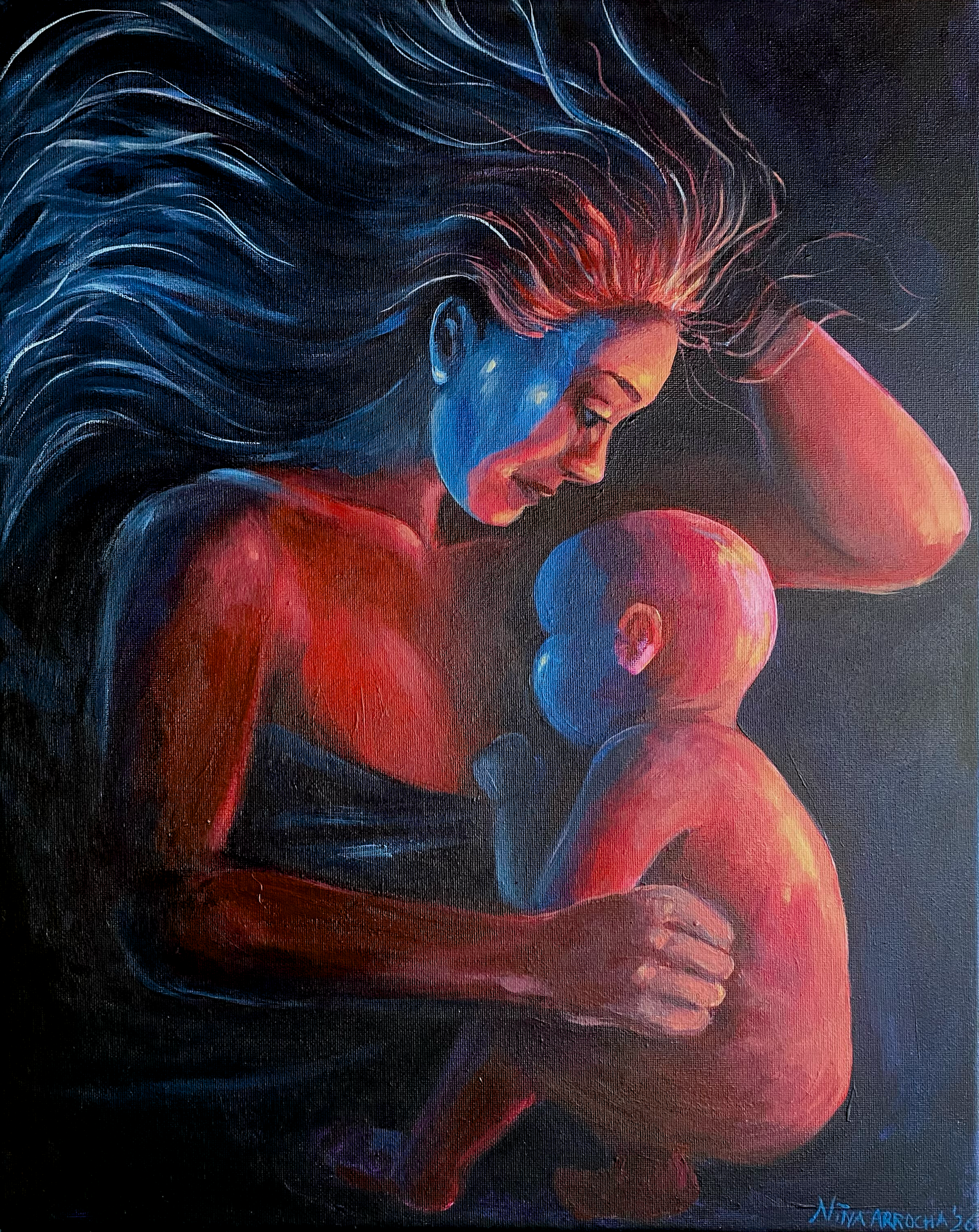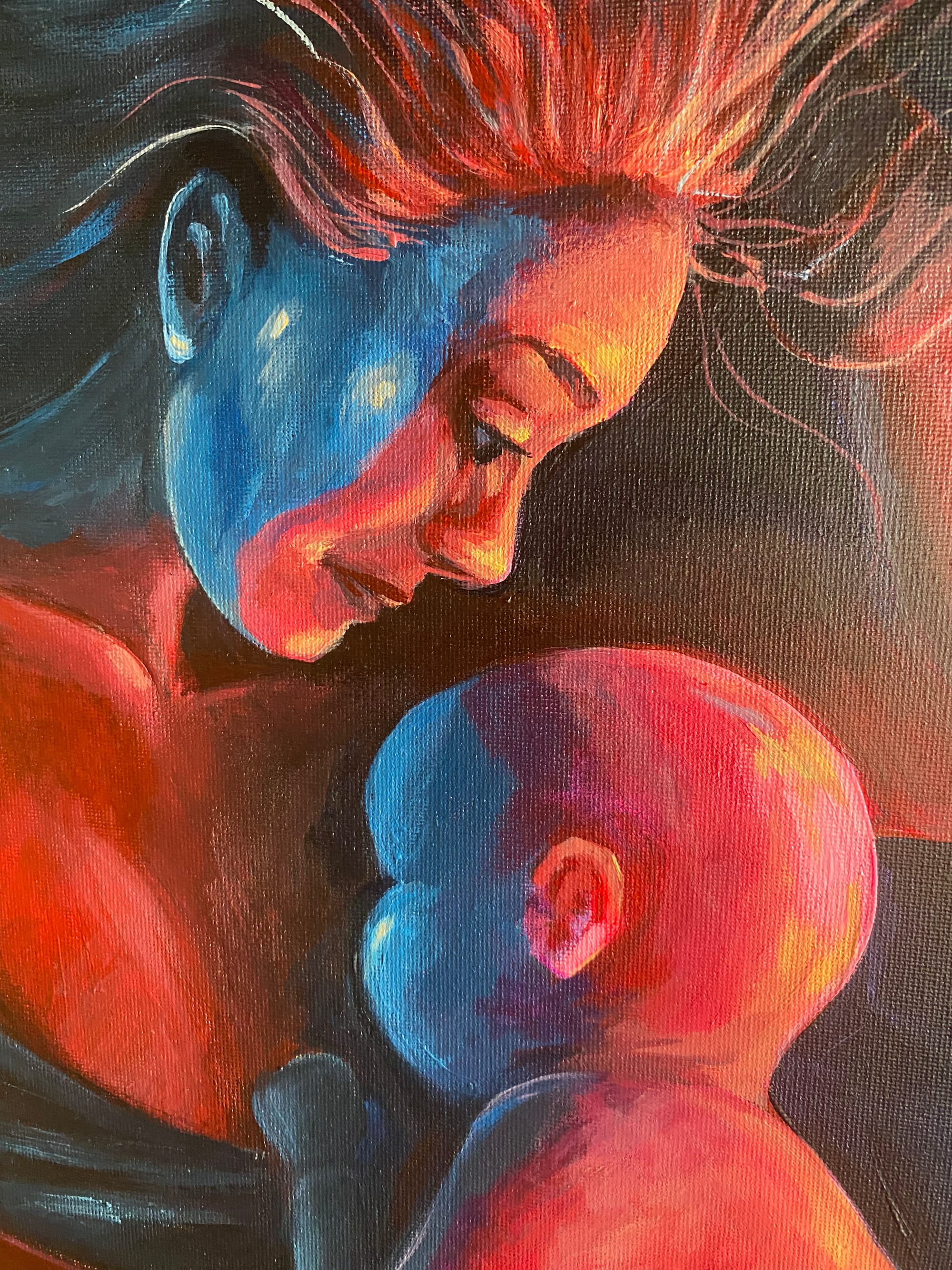 Jeg har grundlæggende arbejdet med to farver - den kolde blå og den varme magenta. Farverne skal være med til at se kontrasten i forældreskabet og hvorledes jeg selv har haft det i mit moderskab i den tidlige del af mine børns barndom.